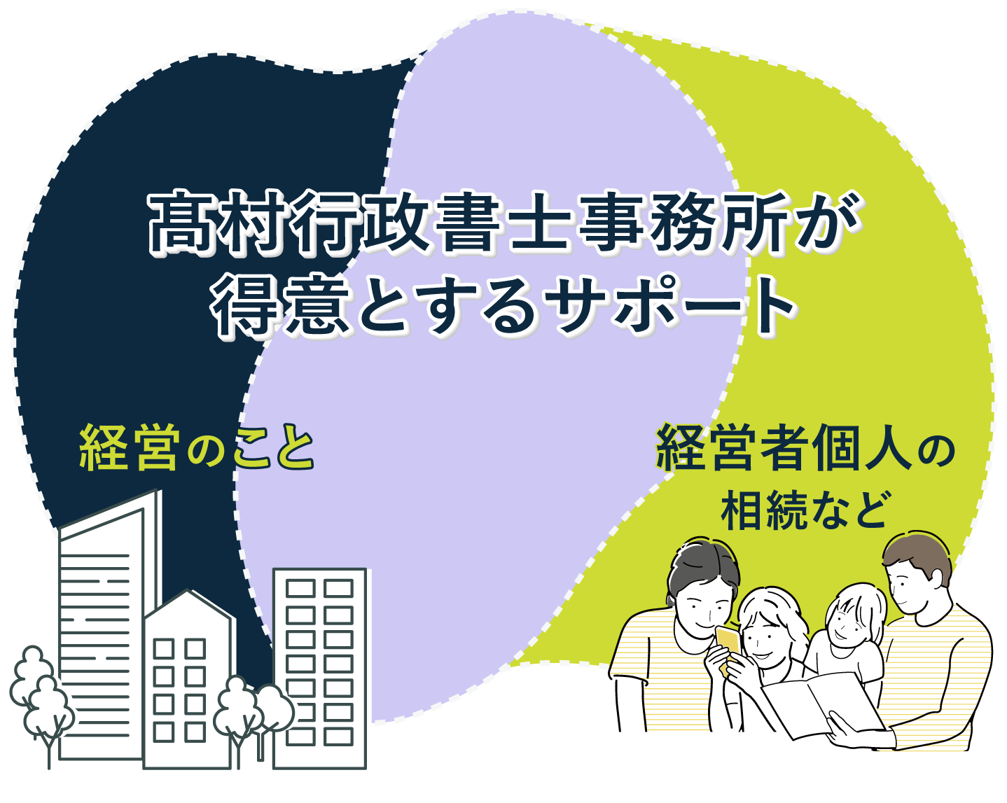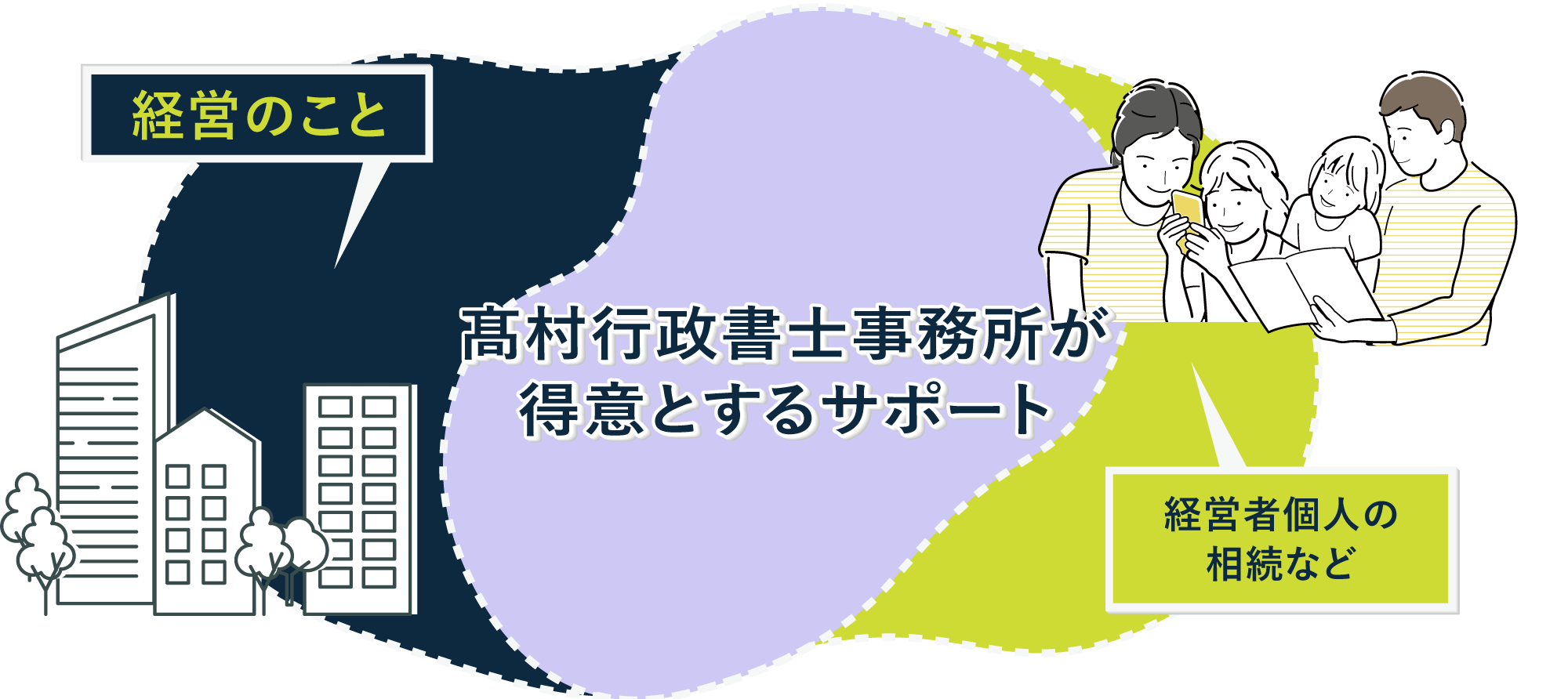 当事務所では長年、「事業者支援」(経営コンサルティング・補助金申請・法律事務など)と「個人問題」(相続・終活など)を専門としております。